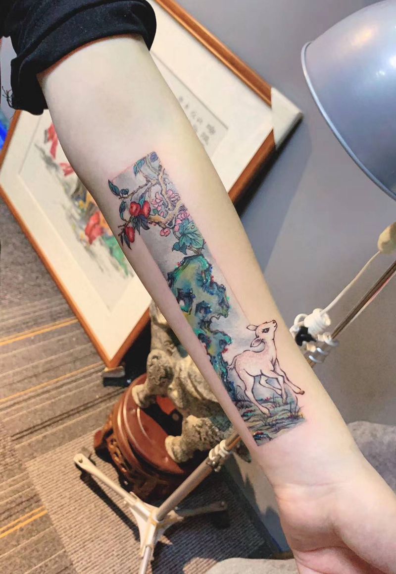 当前位置: 首页 >广东省汕尾市纹身店-丰翼轩刺青纹身图案>【国画纹身·一鹿喜柿】纹身图片_手臂新传统水墨国画纹身图案