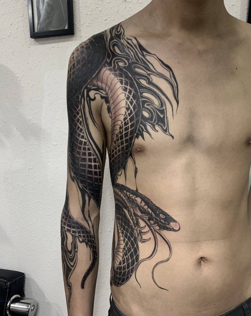 当前位置: 首页 >广东省惠州市纹身店-御天刺青纹身图案>王蛇纹身图片_手臂腰部点刺新传统蛇纹身图案