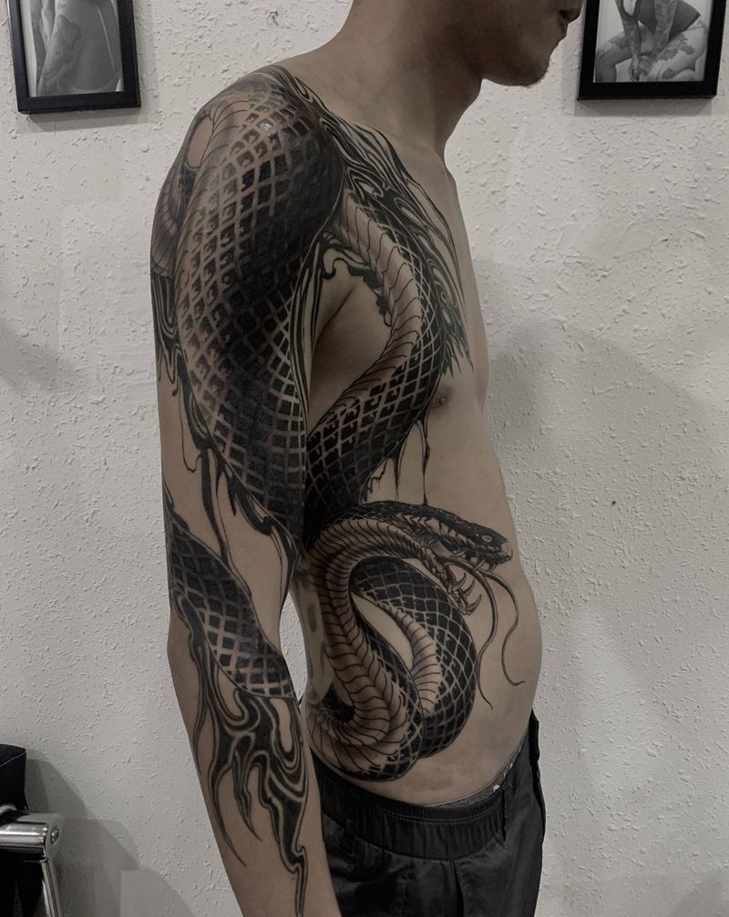 当前位置: 首页 >广东省惠州市纹身店-御天刺青纹身图案>王蛇纹身图片_手臂腰部点刺新传统蛇纹身图案