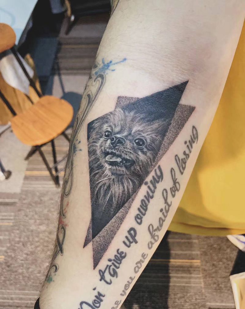 博美犬黑灰写实纹身图片_手臂欧美写实点刺纹身图案