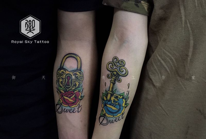 当前位置: 首页 >广东省惠州市纹身店-御天刺青纹身图案>情侣锁匙纹身图片_手臂Old School水彩情侣锁匙纹身图案