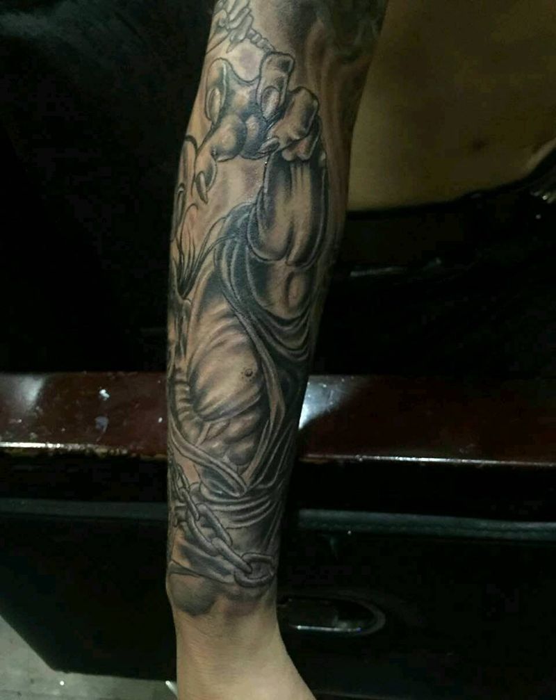 当前位置: 首页 >广东省惠州市纹身店-御天刺青纹身图案>黑白无常纹身图片_手臂传统人物鬼神宗教成品纹身图案
