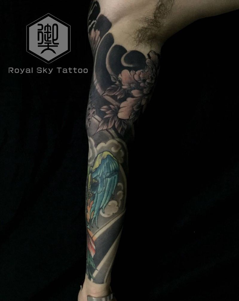 • T网红王老大花腿龙纹身图片_腿部新传统纹身图案