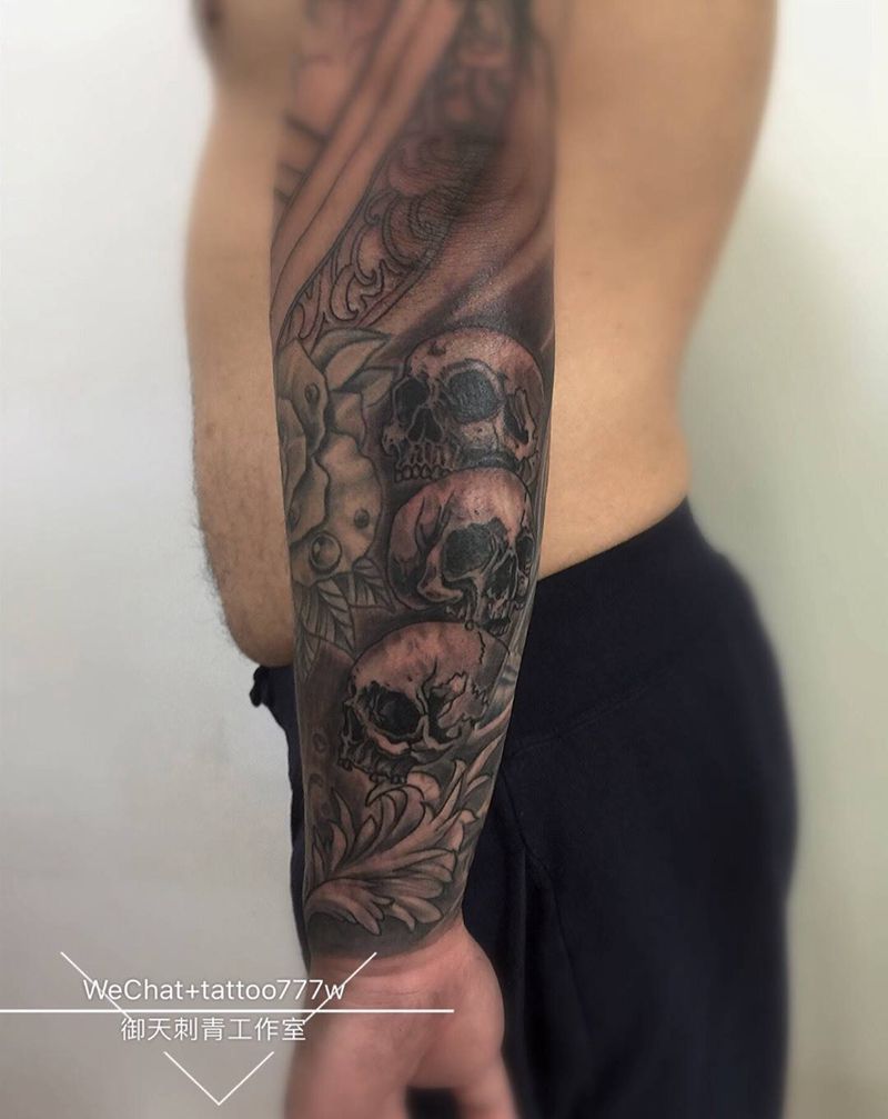 当前位置: 首页 >广东省惠州市纹身店-御天刺青纹身图案>拼接包臂下次继续纹身图片_成品手臂写实传统人物鬼神纹身图案