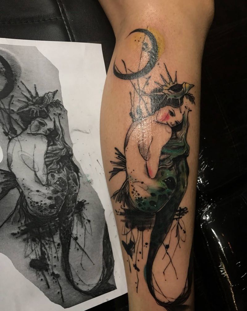 美人鱼纹身图片_成品手稿插画腿部欧美清新人物纹身图案