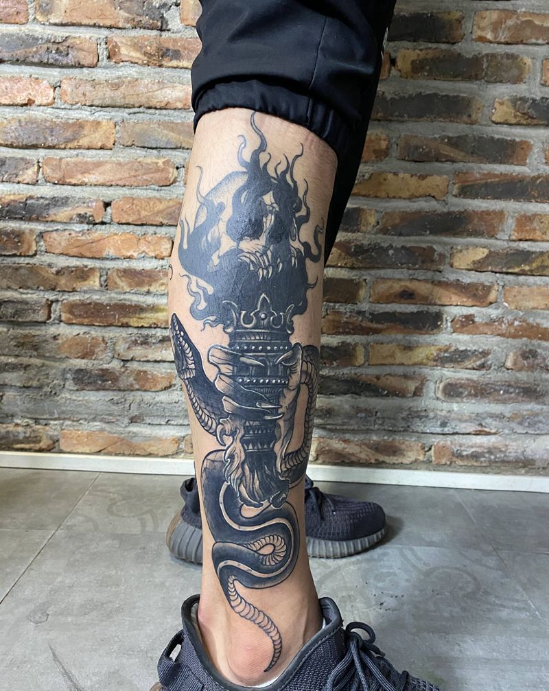 暗黑风格全遮盖纹身图片_腿部暗黑纹身图案