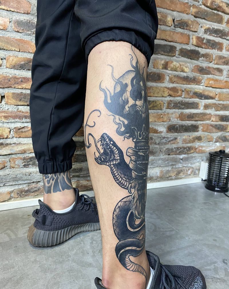 暗黑风格全遮盖纹身图片_腿部暗黑纹身图案