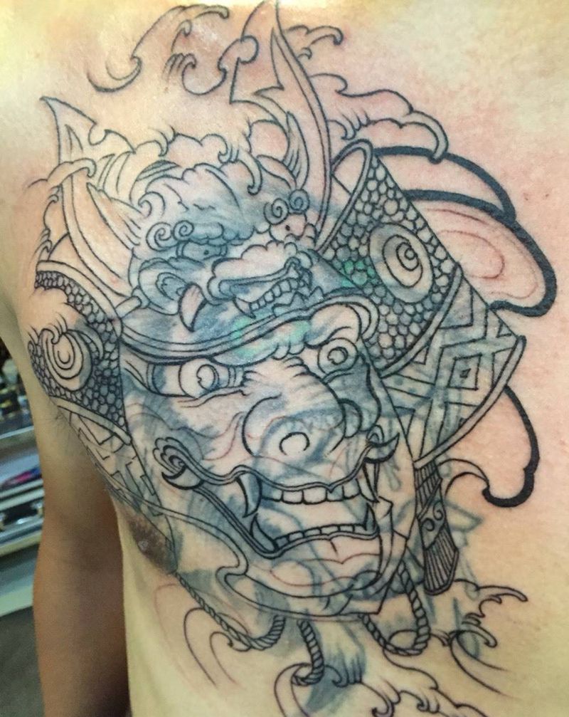 当前位置: 首页 >广东省东莞市纹身店-广东紋憶刺青纹身图案>纹忆刺青出品,鬼武士盖狼头未完成纹身图片