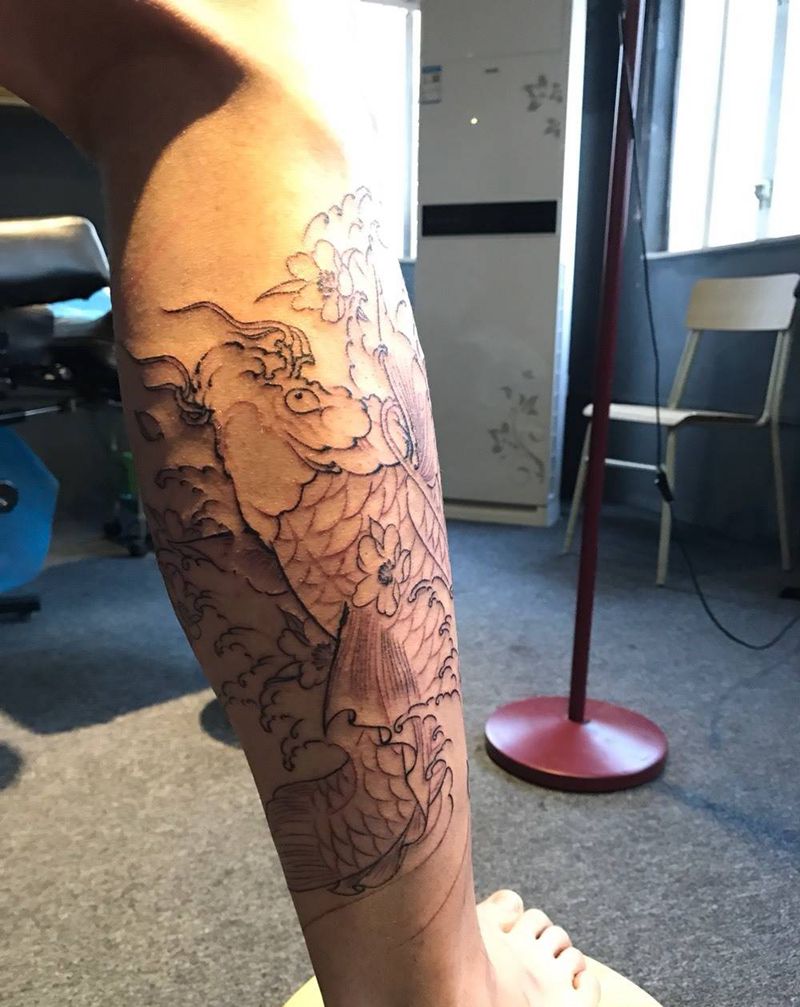 • T网红王老大花腿龙纹身图片_腿部新传统纹身图案