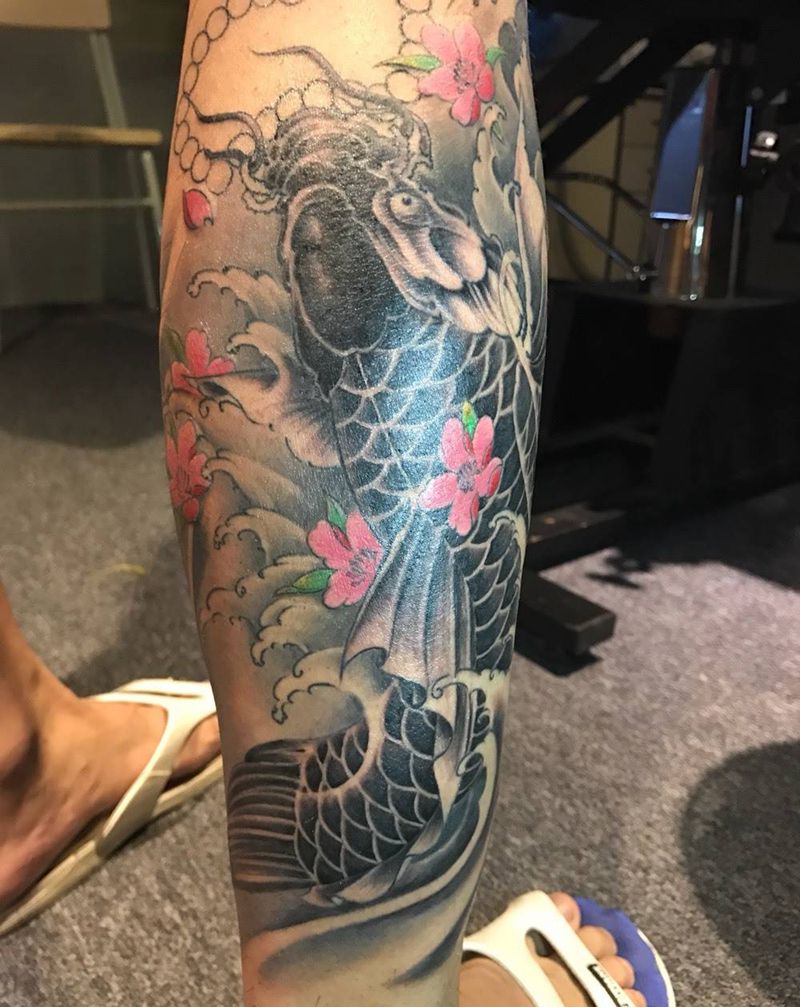 • T网红王老大花腿龙纹身图片_腿部新传统纹身图案