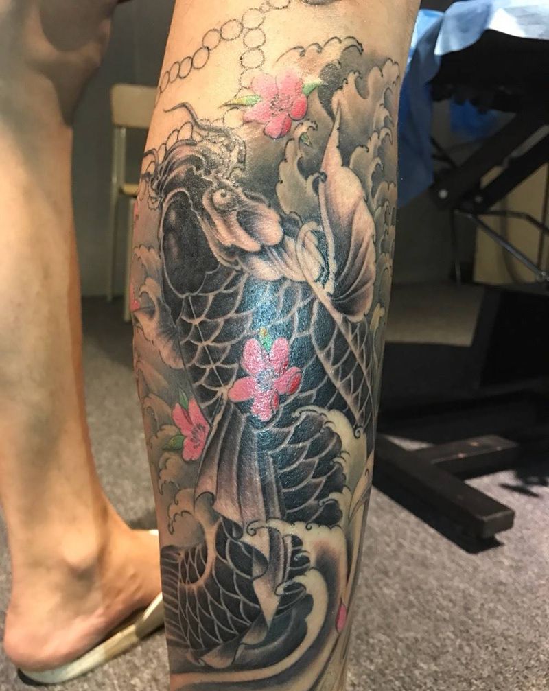 • T网红王老大花腿龙纹身图片_腿部新传统纹身图案