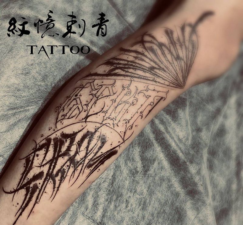 暗黑花体待续纹身图片_腿部花体字纹身图案