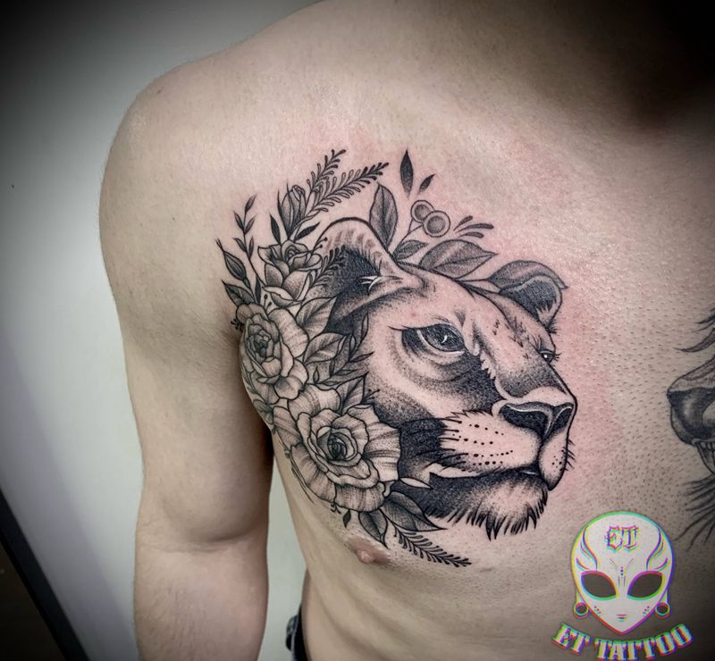 当前位置: 首页 >广东省东莞市纹身店-ET TATTOO纹身图案>狮子纹身图片_胸部肩部欧美写实点刺纹身图案