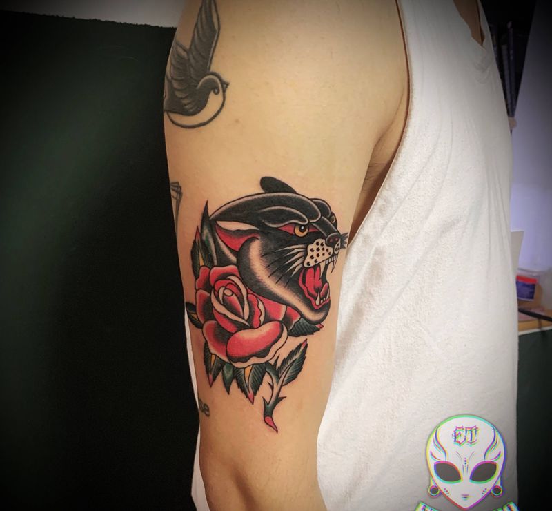 当前位置: 首页 >广东省东莞市纹身店-ET TATTOO纹身图案>黑豹玫瑰纹身图片_手部手臂Old School纹身图案