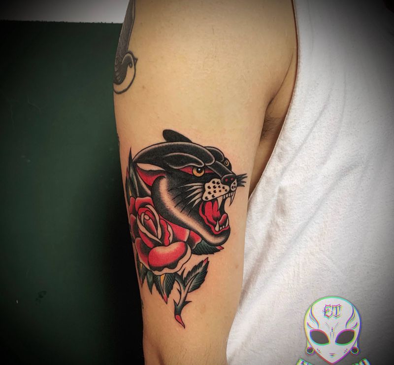 当前位置: 首页 >广东省东莞市纹身店-ET TATTOO纹身图案>黑豹玫瑰纹身图片_手部手臂Old School纹身图案