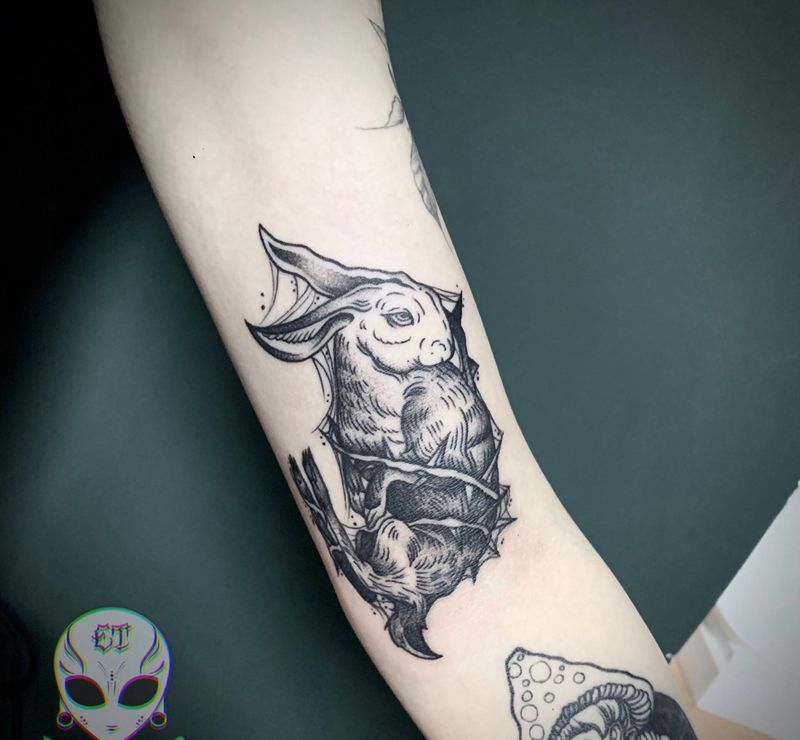 当前位置: 首页 >广东省东莞市纹身店-ET TATTOO纹身图案>暗黑兔子纹身图片_手臂手部点刺纹身图案