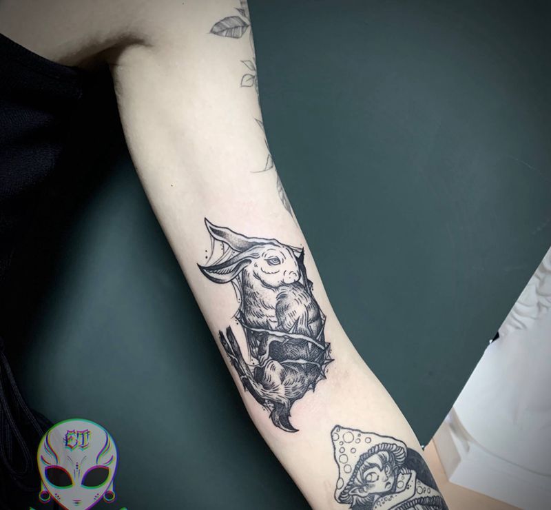 当前位置: 首页 >广东省东莞市纹身店-ET TATTOO纹身图案>暗黑兔子纹身图片_手臂手部点刺纹身图案