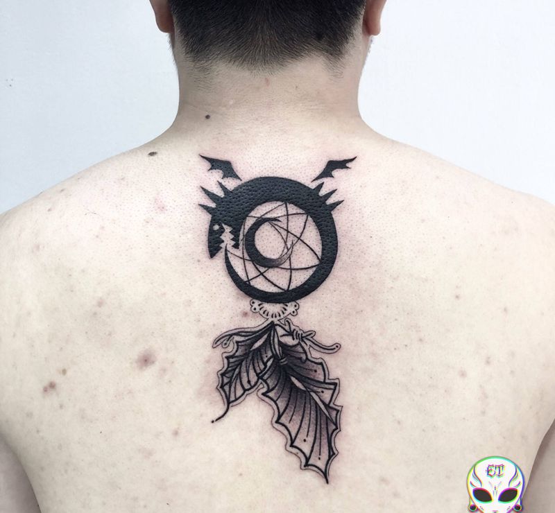 当前位置: 首页 >广东省东莞市纹身店-ET TATTOO纹身图案>按客人想法设计的捕梦网纹身图片_背部纹身图案
