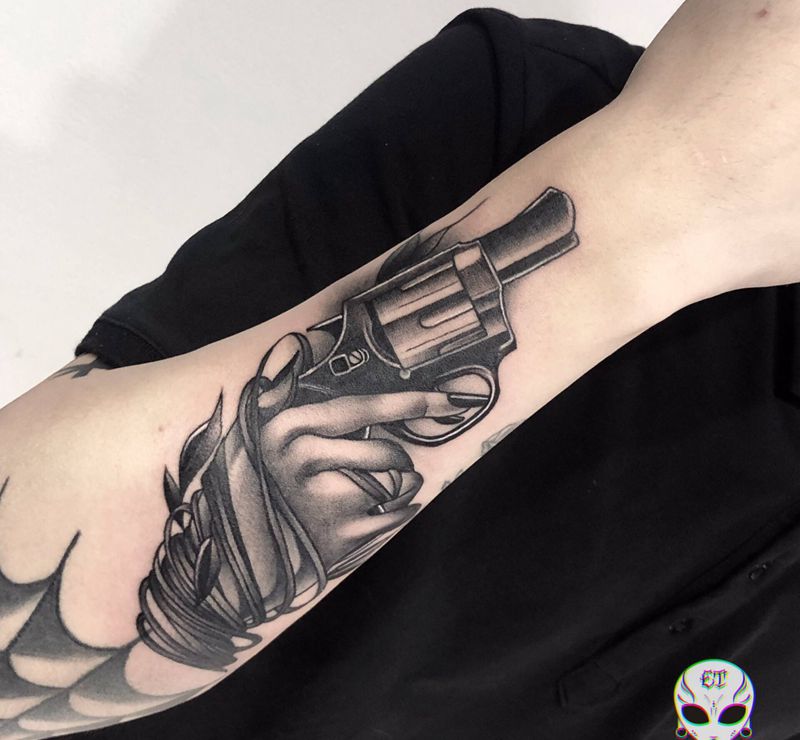 当前位置: 首页 >广东省东莞市纹身店-ET TATTOO纹身图案>手枪➕荆棘包满纹身图片_手臂纹身图案