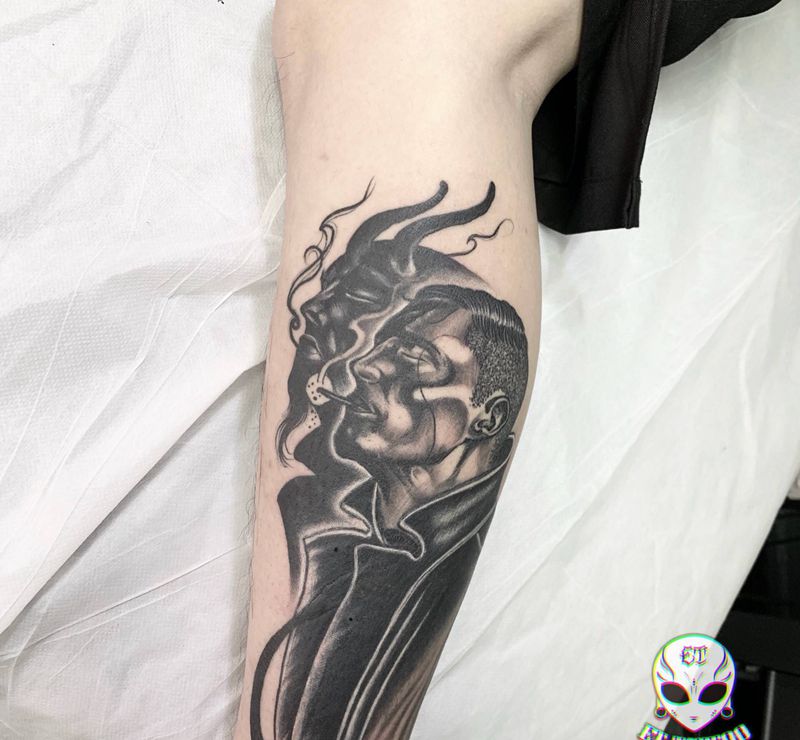 • T包小腿吹火男+阿多福纹身图片_腿部老传统新传统吹火男阿