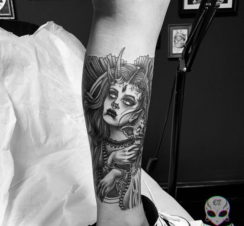 当前位置: 首页 >广东省东莞市纹身店-ET TATTOO纹身图案>暗黑女郎纹身图片_腿部欧美写实纹身图案