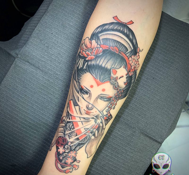 彩色艺妓纹身图片_手臂新传统纹身图案