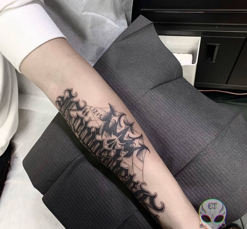 当前位置: 首页 >广东省东莞市纹身店-ET TATTOO纹身图案>硬花体纹身图片_手臂手部花体字纹身图案