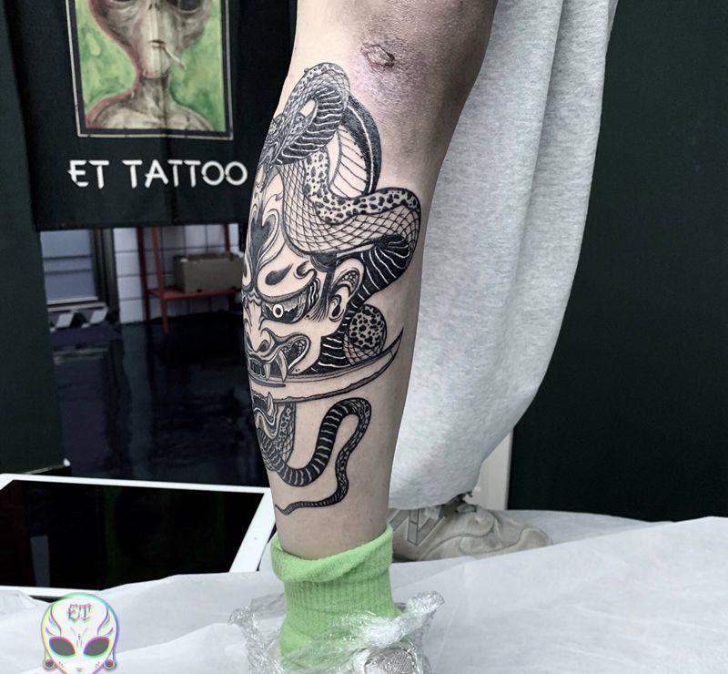 当前位置: 首页 >广东省东莞市纹身店-ET TATTOO纹身图案>暗黑般若与蛇纹身图片_腿部纹身图案