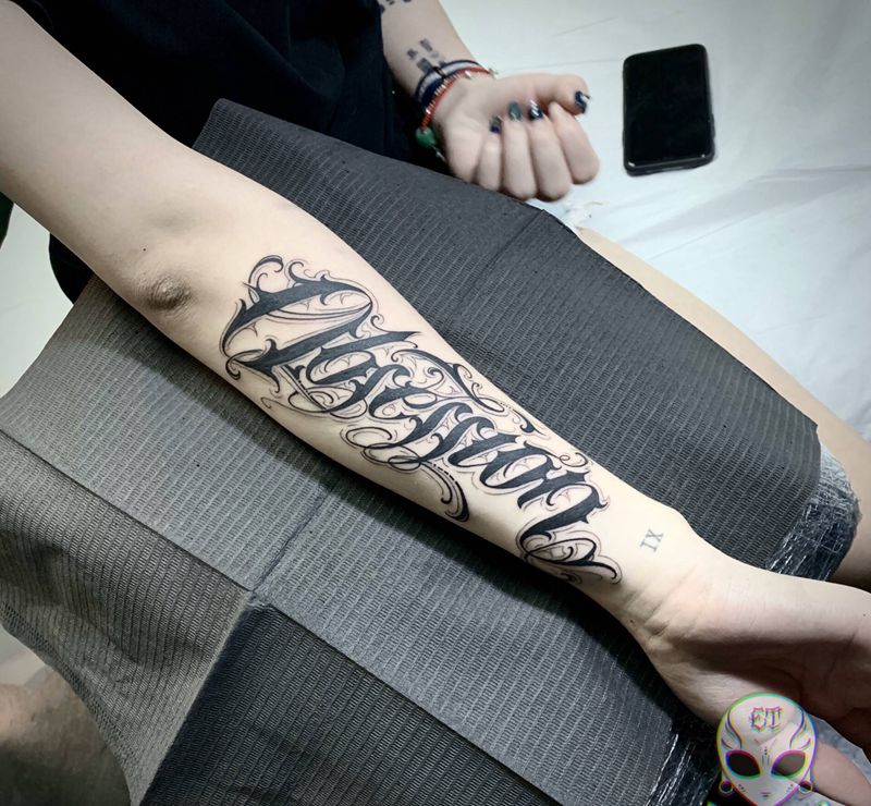 当前位置: 首页 >广东省东莞市纹身店-ET TATTOO纹身图案>独家设计花体一则纹身图片_手部手臂纹身图案