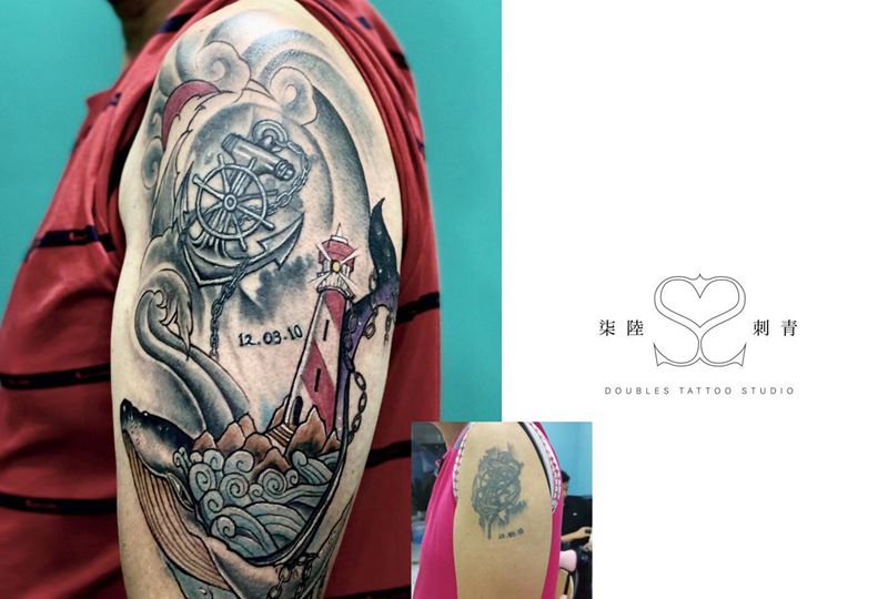 当前位置: 首页 >广东省阳江市纹身店-没有纹身图案>最近作品纹身图片_胸部手臂Old School水墨纹身图案