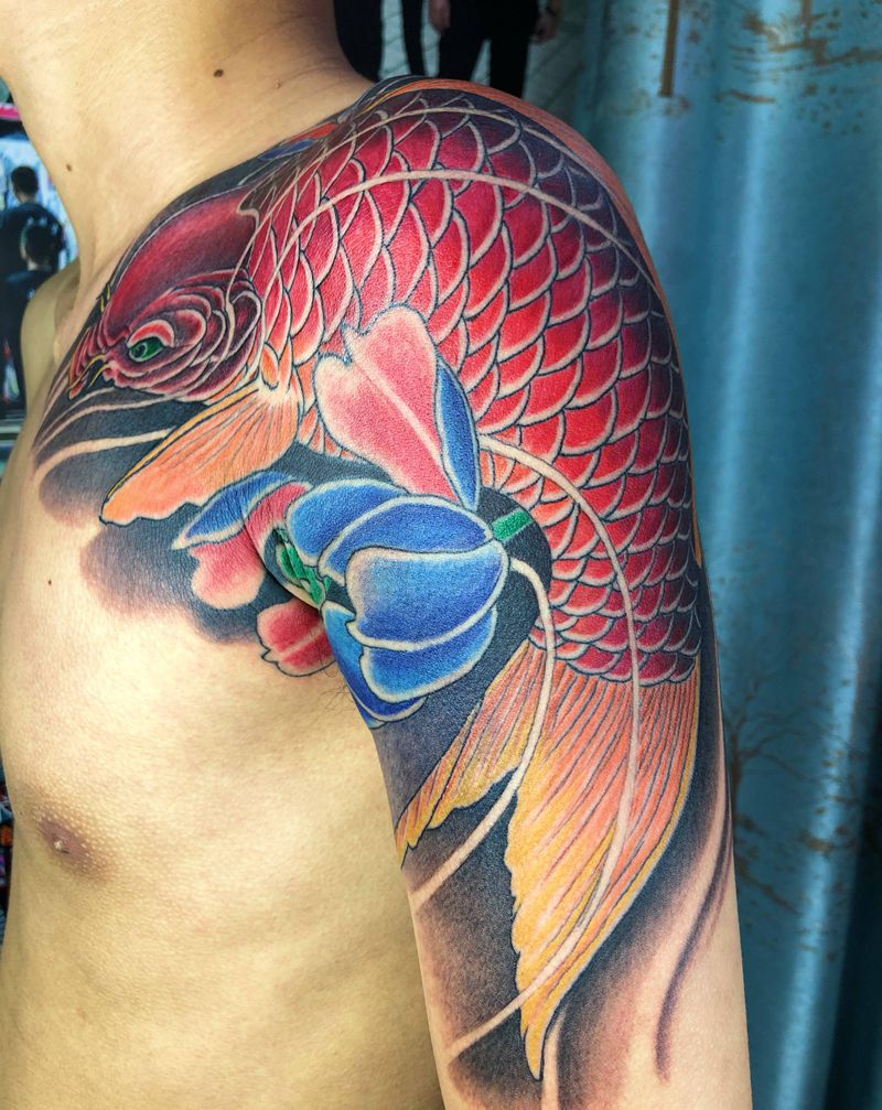 过肩鱼纹身图片_肩部手臂新传统纹身图案