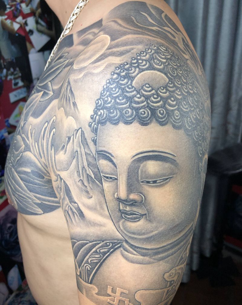 半甲佛像纹身图片_手臂胸部新传统纹身图案
