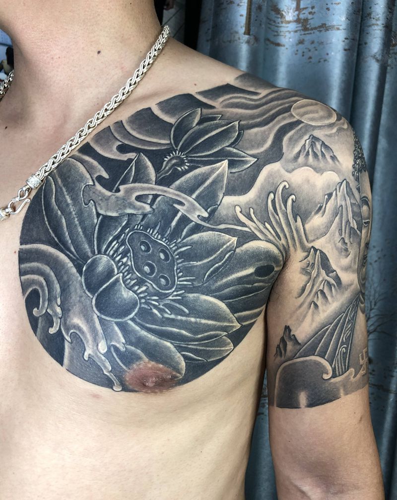 半甲佛像纹身图片_手臂胸部新传统纹身图案