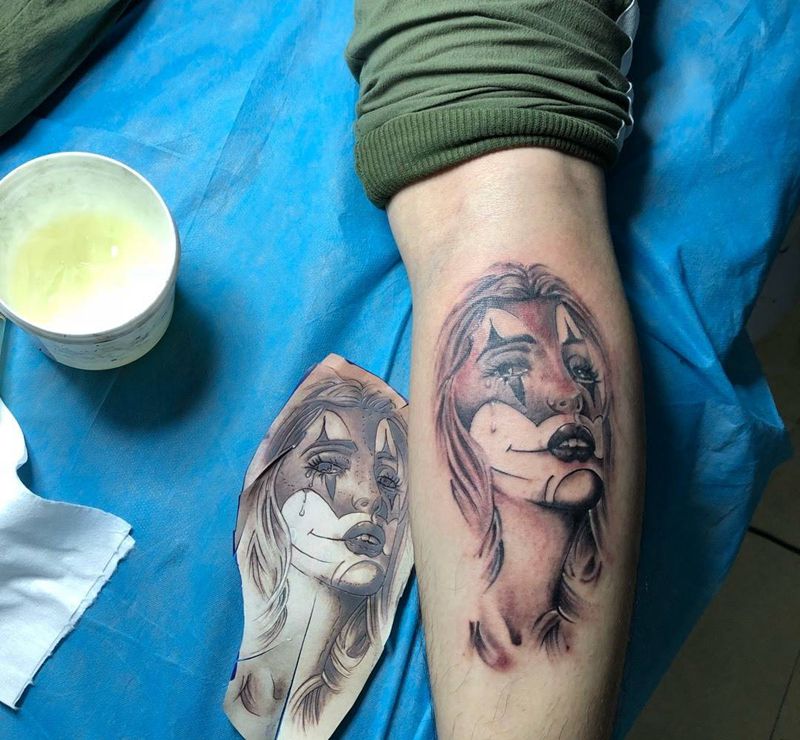 • T包小腿吹火男+阿多福纹身图片_腿部老传统新传统吹火男阿