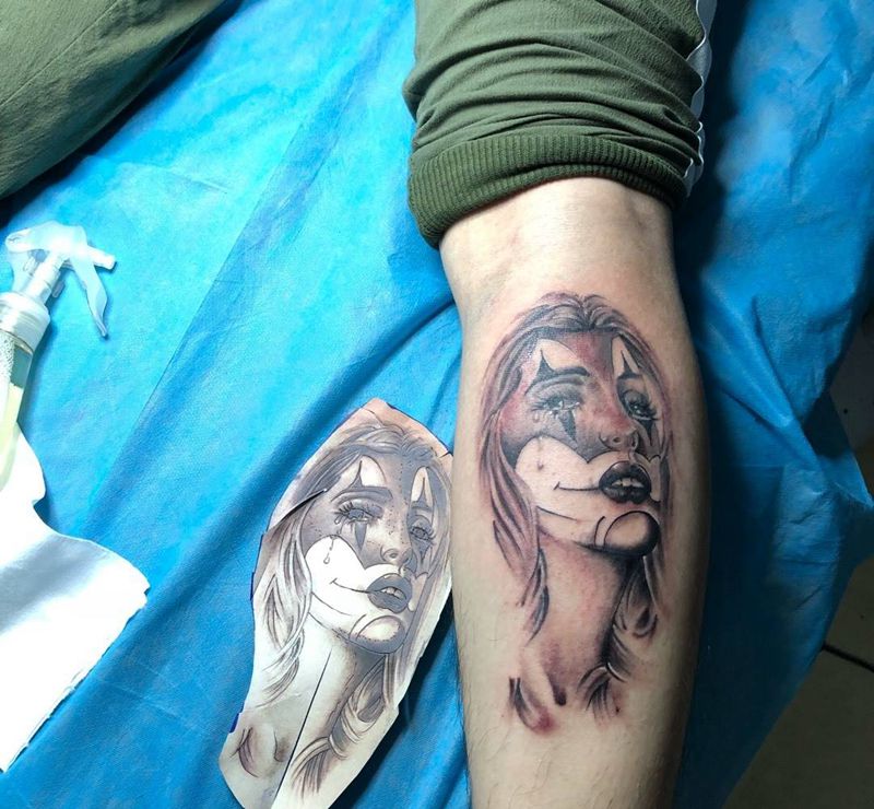 • T包小腿吹火男+阿多福纹身图片_腿部老传统新传统吹火男阿