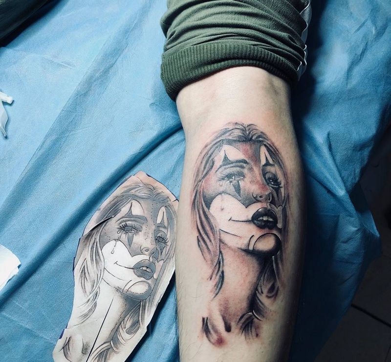 • T包小腿吹火男+阿多福纹身图片_腿部老传统新传统吹火男阿
