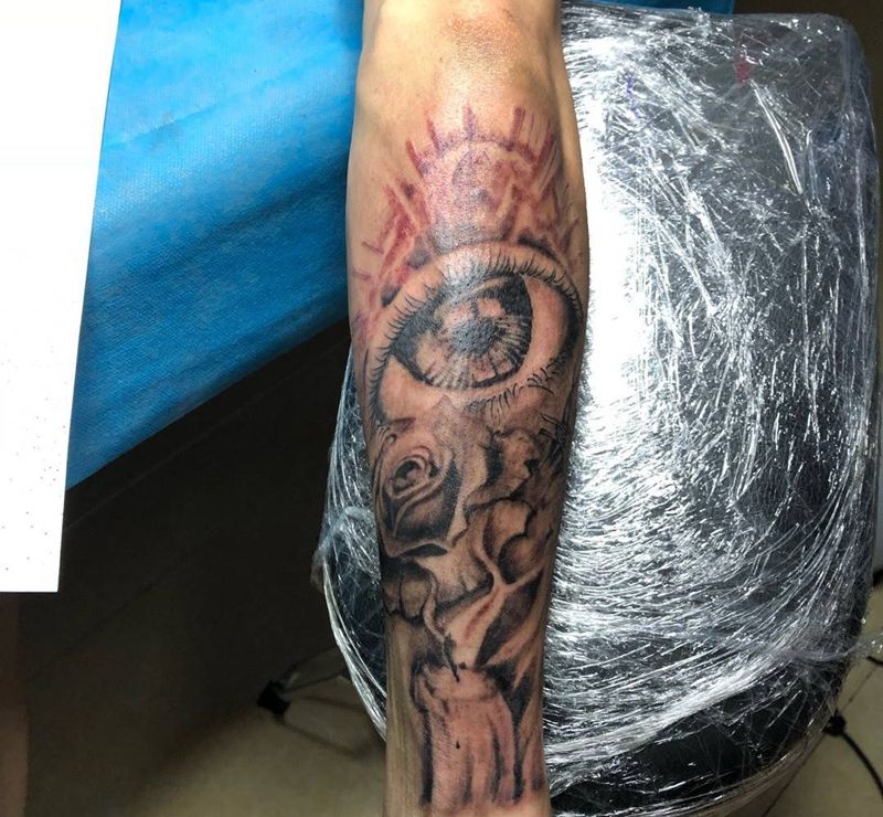 • 手背潮流时尚的玫瑰花眼睛纹身图案