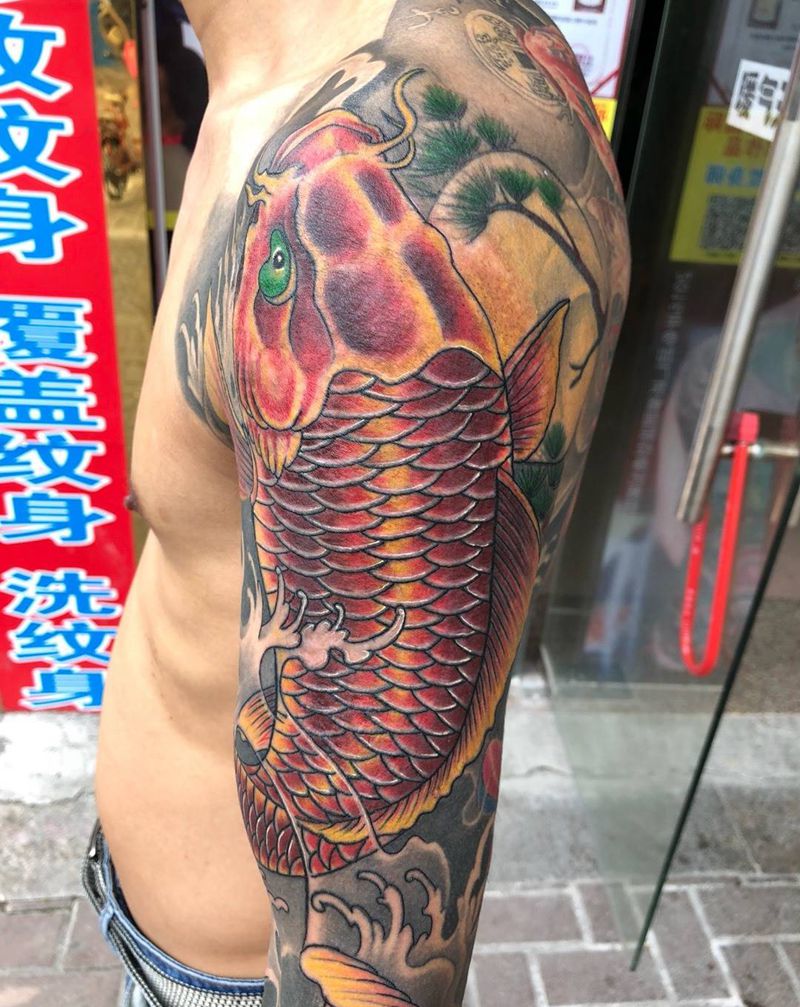 花臂鱼纹身图片_东莞生龙堂微信:15112866886学包会常年招生成品手臂传统动物纹身图案