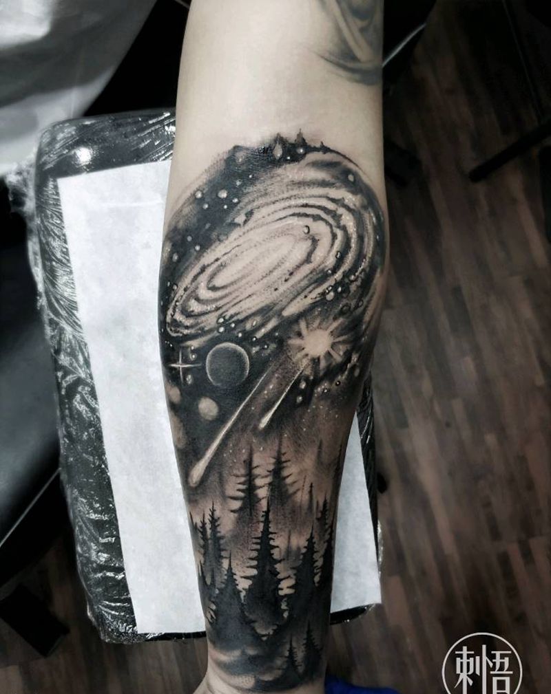 当前位置: 首页 >广东省东莞市纹身店-刺悟纹身工作室纹身图案>星空森林纹身图片_手臂欧美写实纹身图案