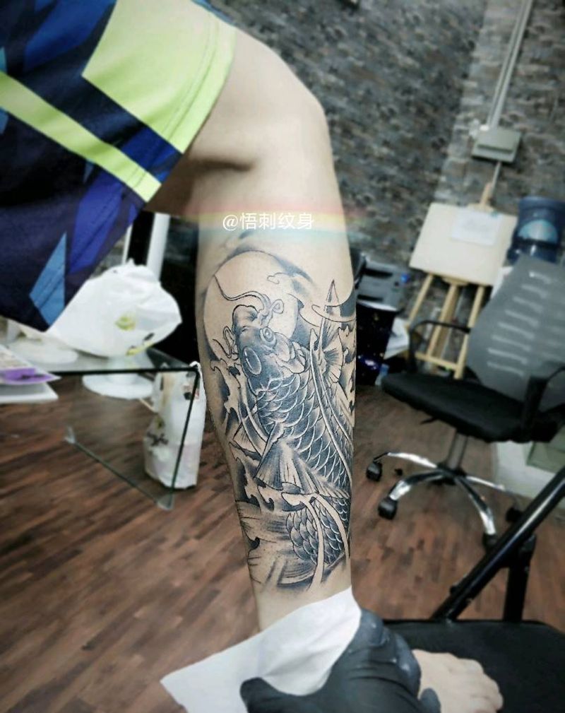 当前位置: 首页 >广东省东莞市纹身店-刺悟纹身工作室纹身图案>传统鲤鱼小腿纹身图片