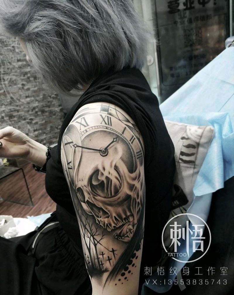 当前位置: 首页 >广东省东莞市纹身店-刺悟纹身工作室纹身图案>骷髅时钟纹身图片_欧美写实纹身图案