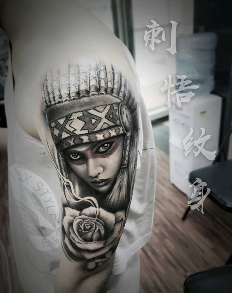 当前位置: 首页 >广东省东莞市纹身店-刺悟纹身工作室纹身图案>印第安女郎纹身图片_手臂欧美写实纹身图案