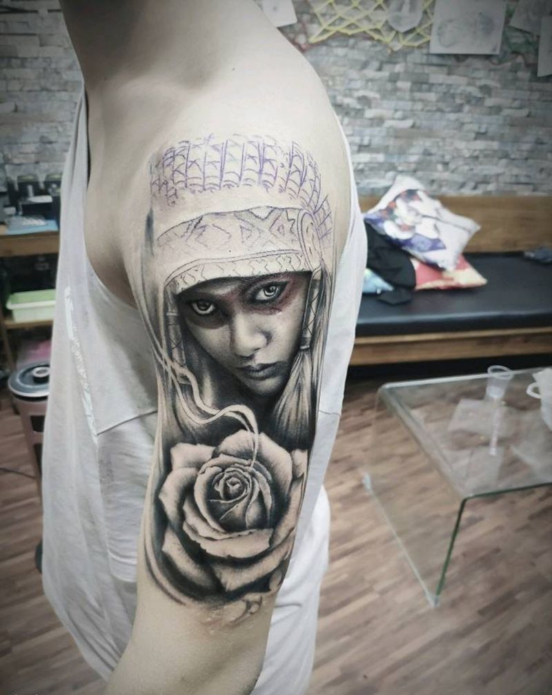 当前位置: 首页 >广东省东莞市纹身店-刺悟纹身工作室纹身图案>印第安女郎纹身图片_手臂欧美写实纹身图案
