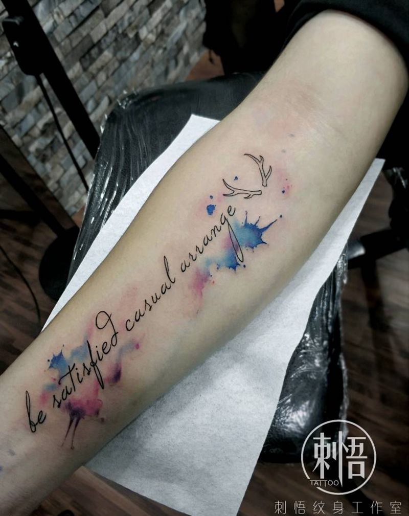 当前位置: 首页 >广东省东莞市纹身店-刺悟纹身工作室纹身图案>泼墨小英文纹身图片_手臂水彩纹身图案