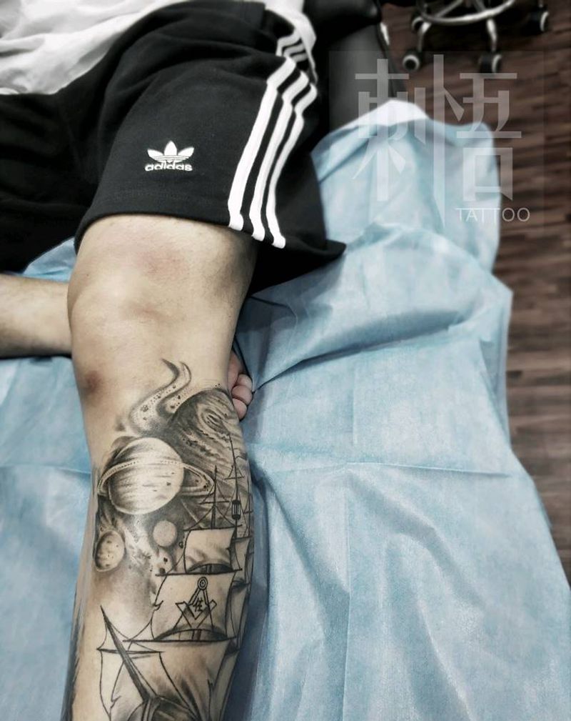 • T网红王老大花腿龙纹身图片_腿部新传统纹身图案