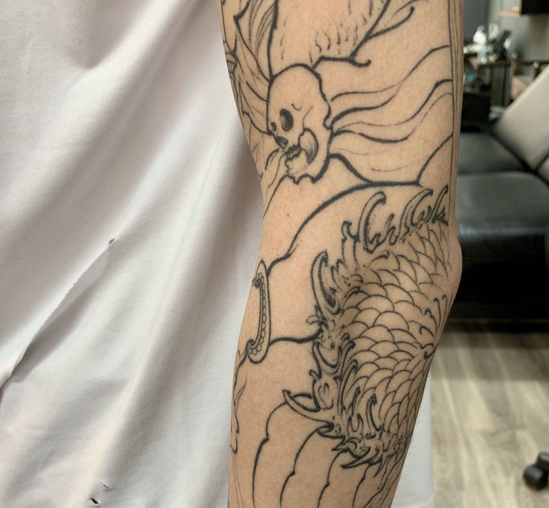 • T网红王老大花腿龙纹身图片_腿部新传统纹身图案