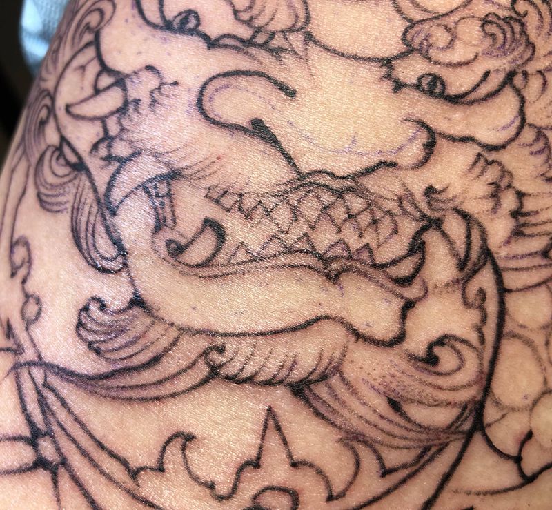 • T网红王老大花腿龙纹身图片_腿部新传统纹身图案