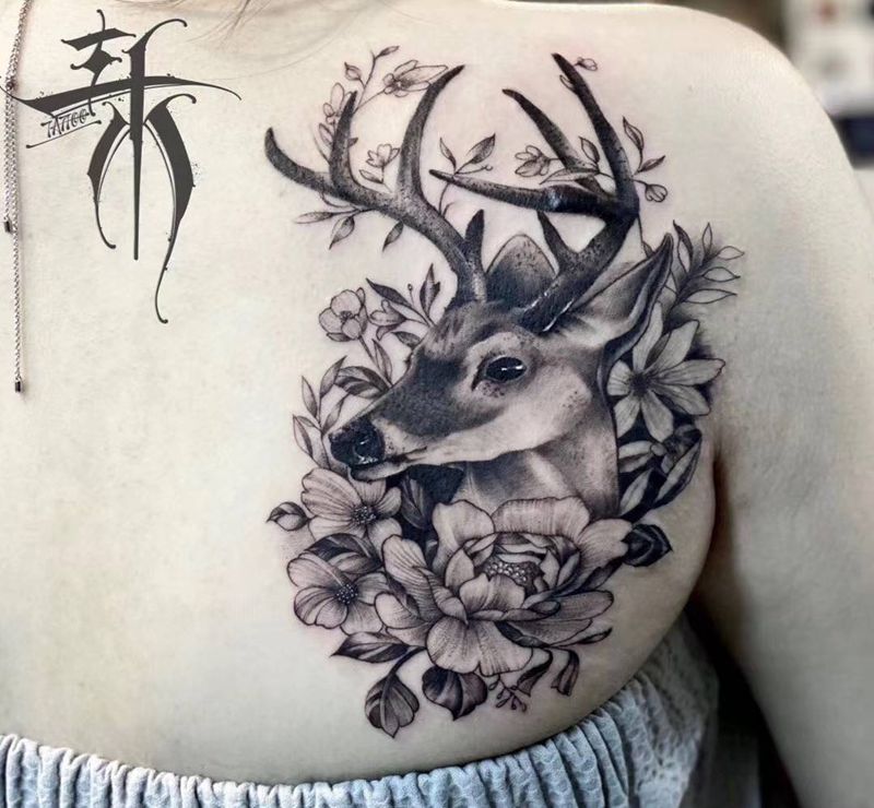 鹿 遮盖纹身图片_肩部Old School纹身图案