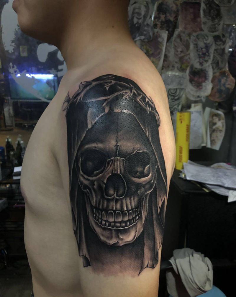 当前位置: 首页 >广东省东莞市纹身店-天龙堂纹身馆纹身图案>☠️骷髅纹身图片_手臂欧美写实纹身图案