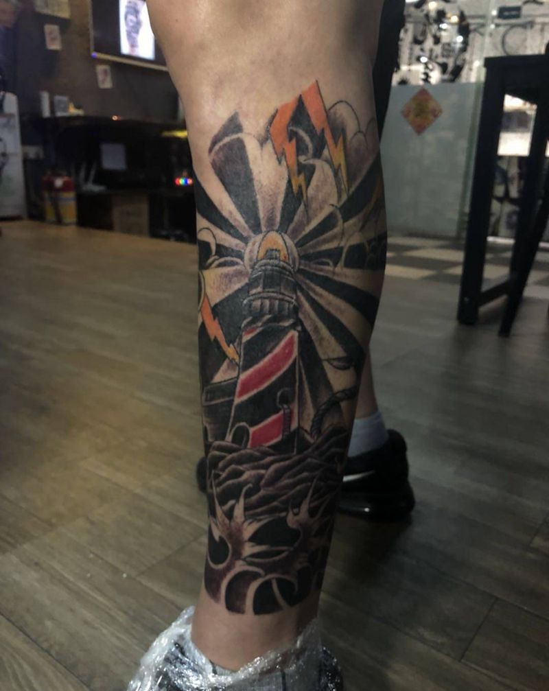 当前位置: 首页 >广东省东莞市纹身店-天龙堂纹身馆纹身图案>灯塔纹身图片_腿部Old School纹身图案
